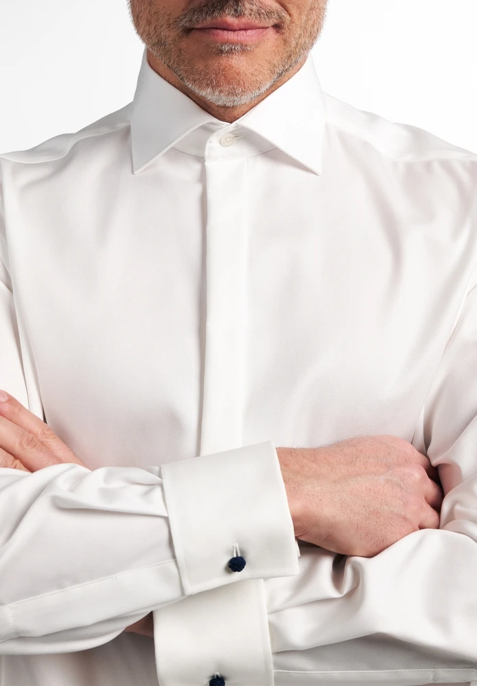 Egal ob Hochzeit,Taufe oder andere festlichen Anlässe – dieses feine Galahemd in bequemer Schnittführung ist für die ganz besonderen Momente in Ihrem Leben.Durch die Umschlagmanschette, den Classic Kent-Kragen und die verdeckte Knopfleiste bringt es besonderen Glamour in Ihr Outfit.Der Stoff ist blickdicht und verbirgt, was darunter unsichtbar sein soll, auch bei Tattoos (Cover Shirt).Die feine Baumwoll-Qualität (bügelfrei) sorgt an diesem einzigartigen Tag für ein besonders angenehmes Tragegefühl, das Sie mit Sicherheit zu schätzen wissenwerden. (Ohne Brusttasche).Kombiniert mit edlen Manschettenknöpfen aus unserem Sortiment ist Ihr Gesamterscheinungsbild perfekt – also worauf warten, heute noch dieses Twill-Langarmhemd bestellen und Ihren Kleiderschrank geschmackvoll und stilsicher ergänzen.