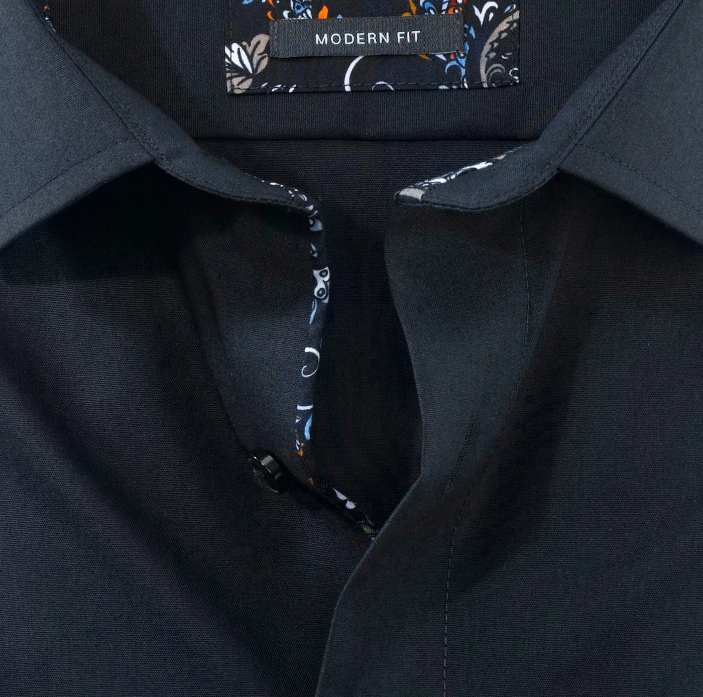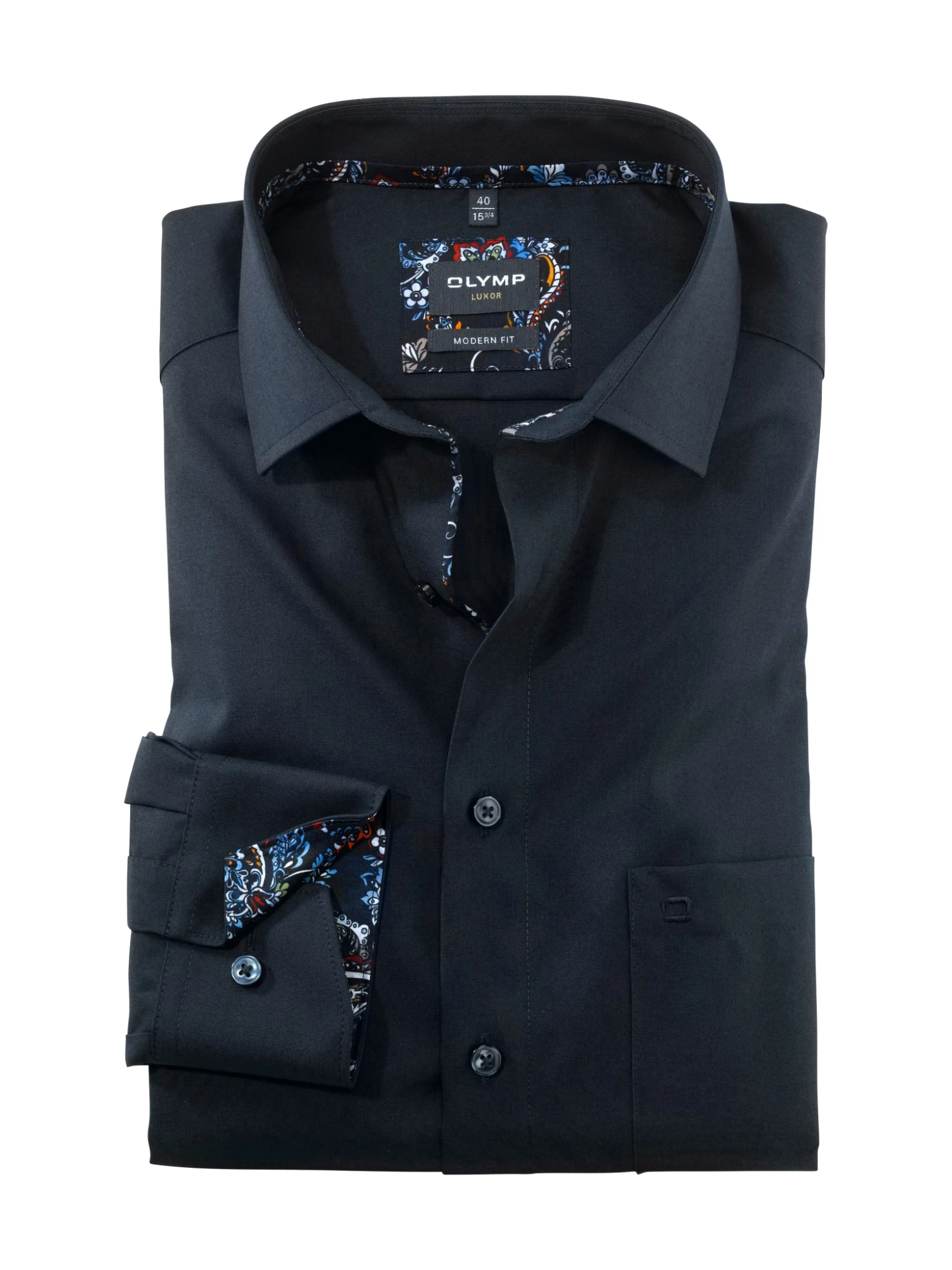 Die Klassiker in Dresscode-Uni dürfen in der Businessgarderobe nicht fehlen, am besten beide Farben parat haben und somit für alle Events gerüstet sein. Fein strukturiert, matt schimmernd und mit attraktivem Kontrastbesatz der Innenseiten versehen, ist dieses OLYMP Luxor modern fit aus reiner, nachhaltig produzierter Baumwolle ein eleganter Allrounder. Der kosmopolitische Global Kent mit den leicht verkürzten Kragenschenkeln kann sehr gut mit Krawatte, aber auch leger nur mit offenem Knopf und ohne Krawatte getragen werden.