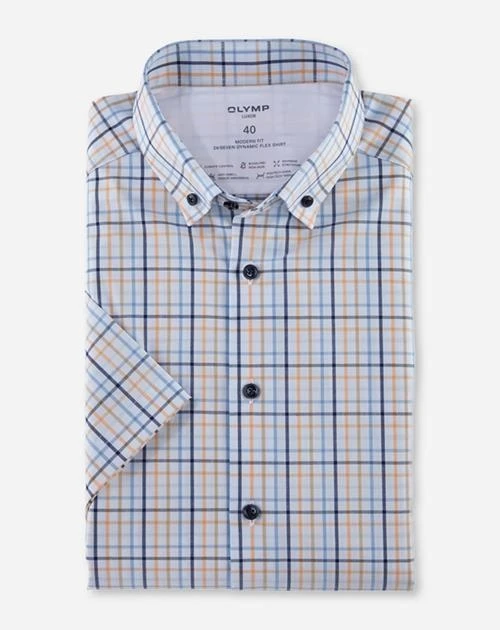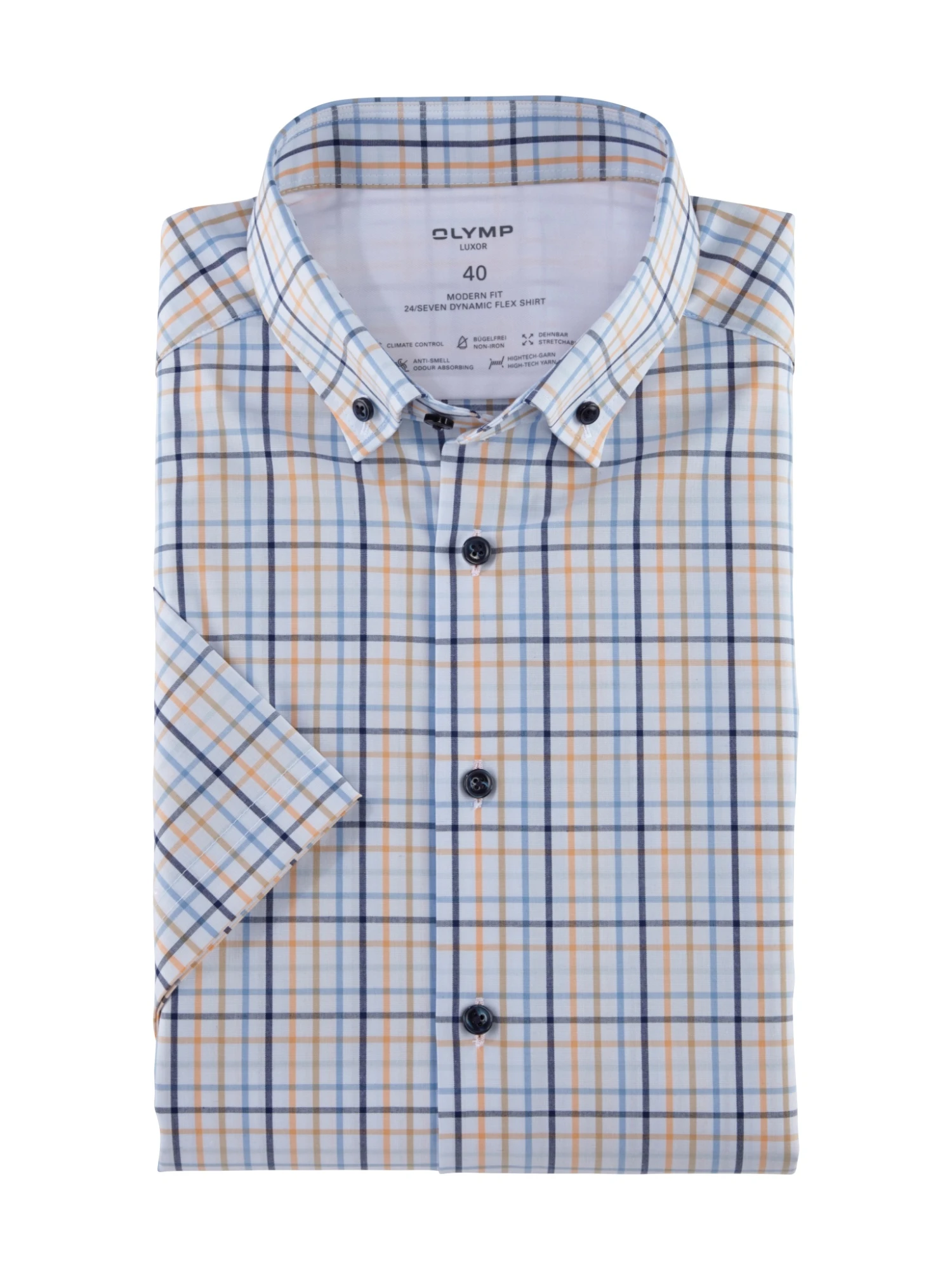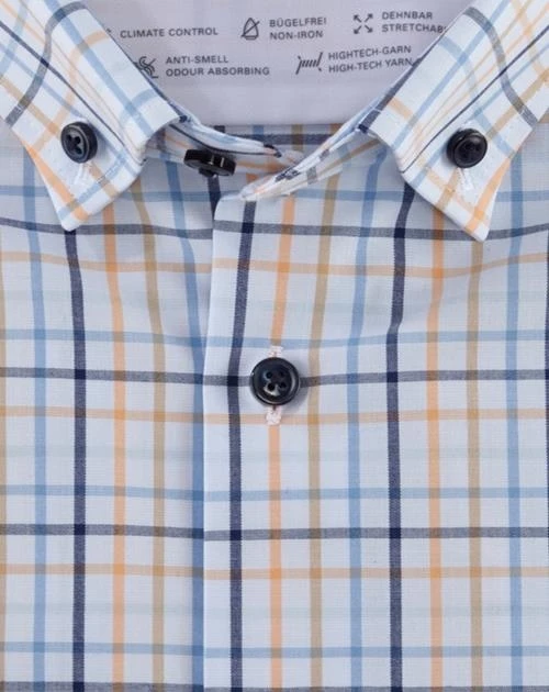 Kreative Karos sind ein zeitgemäßes Statement in der Businesswelt von heute. Die innovative Climate-Control-Textur aus Baumwoll-, Polyester- und Elasthanfasern markiert die Evolution durch unnachahmliche Passform, lässiges Feeling und hautsympathischen Tragekomfort. Dieses sommerlich kurzärmlige OLYMP Luxor 24/Seven Dynamic-Flex-Shirt, kontraststark Mandarin und Blau auf Weiß, punktet mit den bereits bewährten OLYMP Funktionalitäten und setzt noch zwei weitere drauf: Die neue Hemdengeneration ist zusätzlich temperatur- und feuchtigkeitsregulierend. Sie sorgt auch bei sommerlichen Celsiusgraden für überlegte Strategien und coole Moves. Button-down, ideal auch ohne Krawatte und mit offenem Hemdknopf zu tragen.
