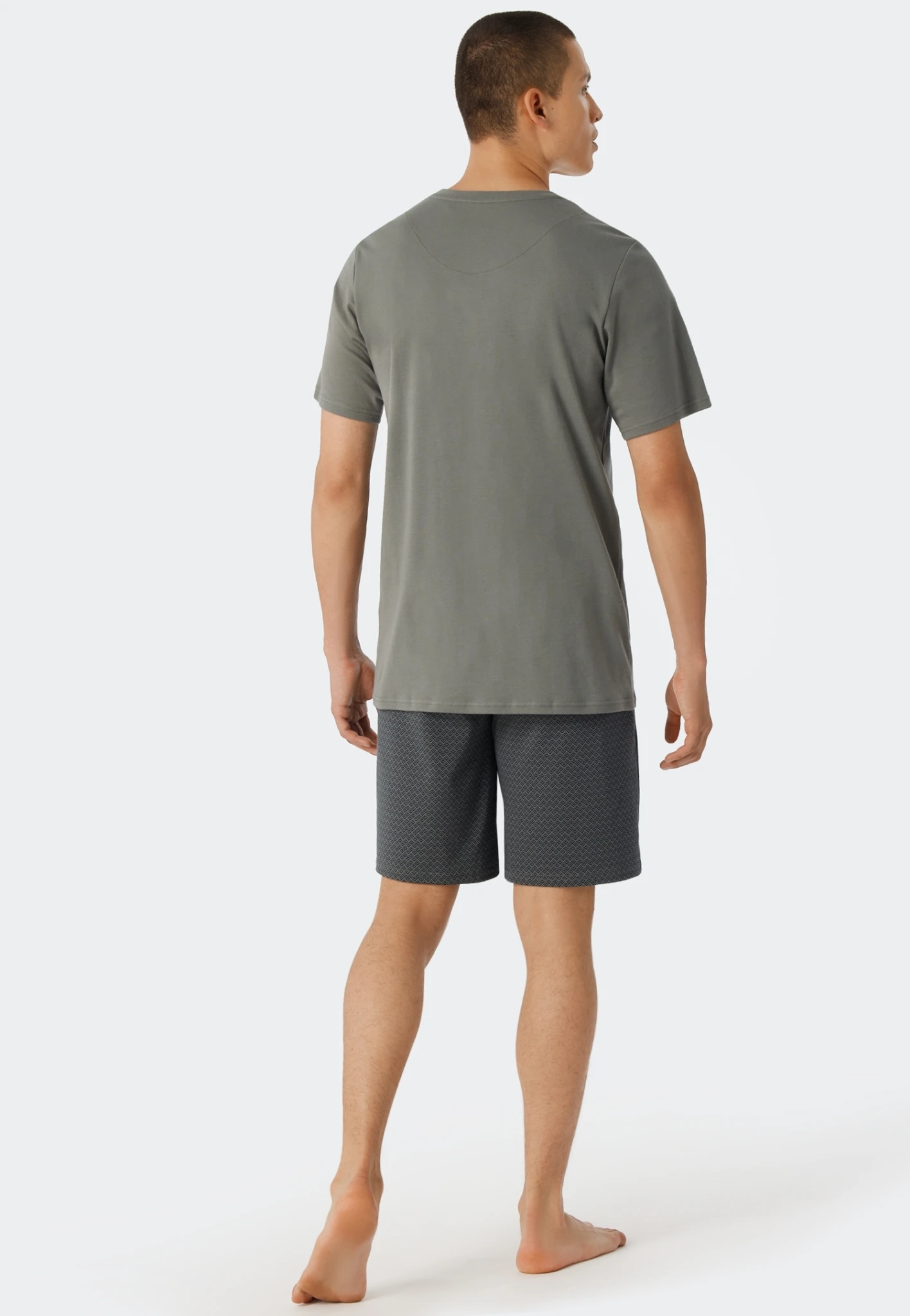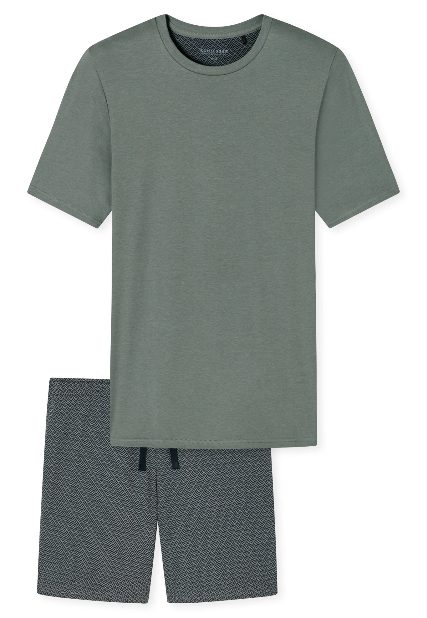 - kurzer Schlafanzug für Herren mit graugrünem T-Shirt und blau-grün gemusterten Shorts, aus der SCHIESSER-Serie „Fine Interlock“